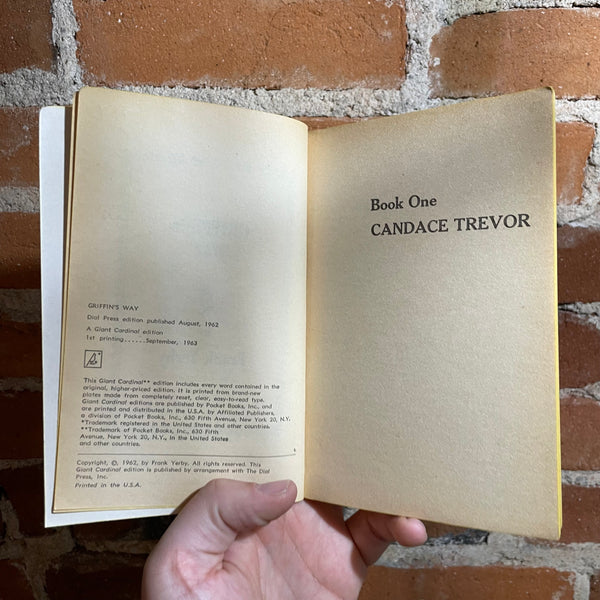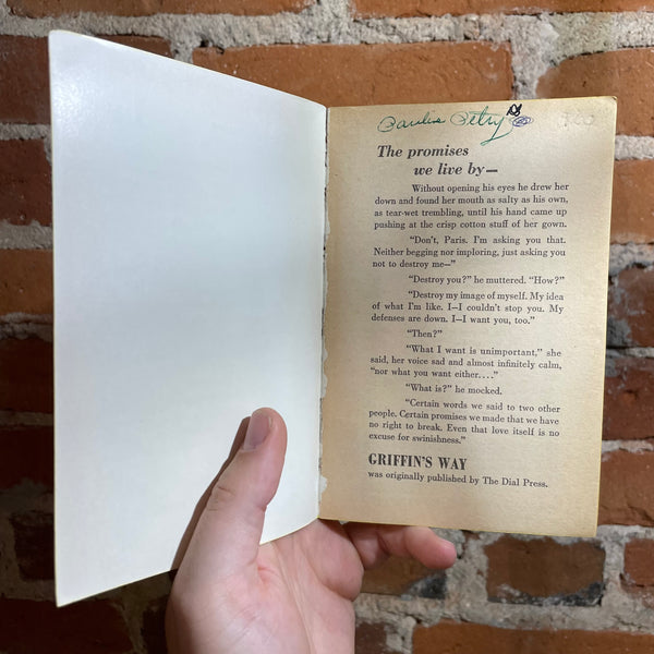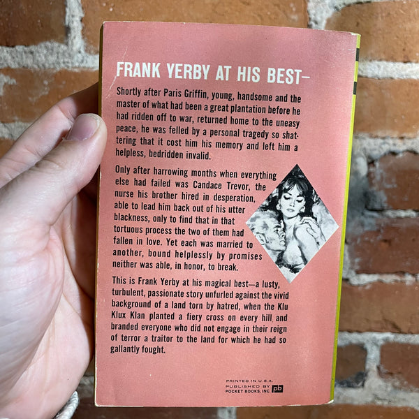 Blurb: "Shortly after Paris Griffin, young, handsome and the master of what had been a Mississippi great plantation before he had ridden off to civil war, returned home to the uneasy peace, he was felled by a personal tragedy so shattering that it cost him his memory and left him a helpless, bedridden invalid. Only after harrowing months when everything else had failed was Candace Trevor, the nurse his brother hired in desperation, able to lead him back out of his utter blackness, only to find that in that tortuous process the two of them had fallen in love. Yet each was married to another, bound helplessly by promises neither was able, in honor, to break.