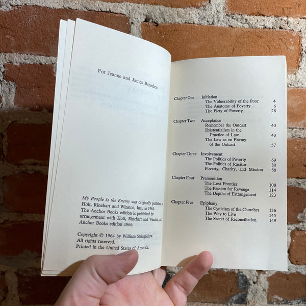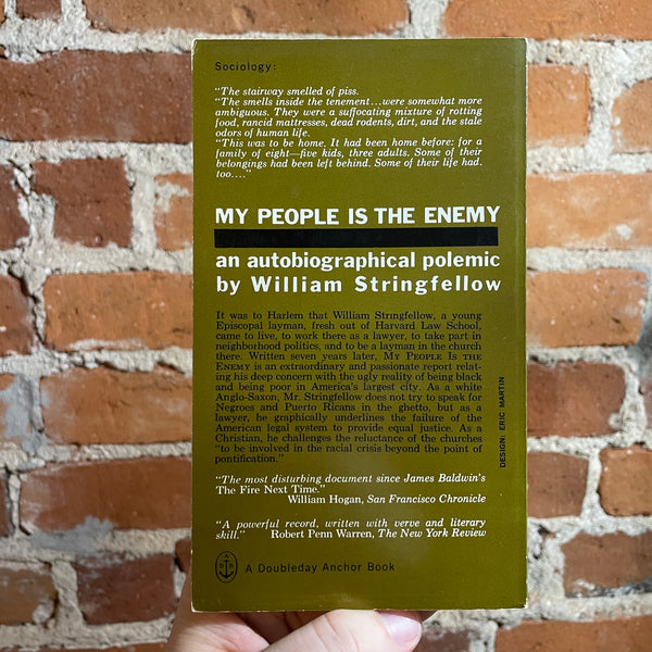 Blurb: “It was to Harlem that I came from the Harvard Law School. I came to Harlem to live, to work there as a lawyer, to take some part in the politics of the neighborhood, to be a layman in the Church there. It is now seven years later. In what I now relate about Harlem, I do not wish to indulge in horror stories, though that would be easy enough to do" In this extraordinary and passionate book, William Stringfellow relates his deep concern with the ugly reality of being black and being poor. As a white Anglo-Saxon, Mr. Stringfellow does not try to speak for African Americans and Puerto Ricans in the Harlem ghetto, but, as a lawyer, he graphically underlines the failure of the American legal system to provide equal justice for the poor. And, as a Christian who lived for seven years on what the New York Times called the worst block in New York City, he challenges the reluctance of the churches to be involved in the racial crisis beyond the point of pontification"”