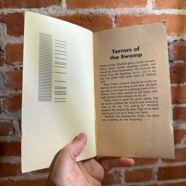 Blurb: “For 'refusing to co-operate' the Emm Luther Special Police took out Earth agent Sam Tallon's eyes and imprisoned him on a dark and eerie swamp from which nobody ever escaped.
