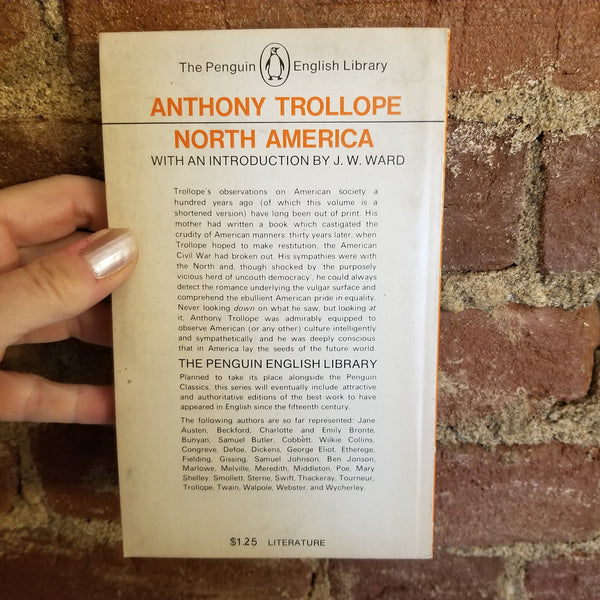 Blurb: Trollope's observations on American society a hundred years ago have long been out of print. His mother had written a book which castigated the crudity of American manners: thirty years later, when Trollope hoped to make restitution, the American Civil War had broken out. His sympathies were with the North and, though shocked by 'the purposely herd of uncouth democracy', he could always detect the romance underlying the vulgar surface and comprehend the ebullient American pride in equality. Never looking down on what he saw, but looking at it, Anthony Trollope was admirably equipped to observe American (or any other) culture intelligently and sympathetically: and he was deeply conscious that in America lay the seeds of the future world.