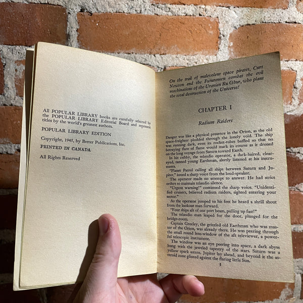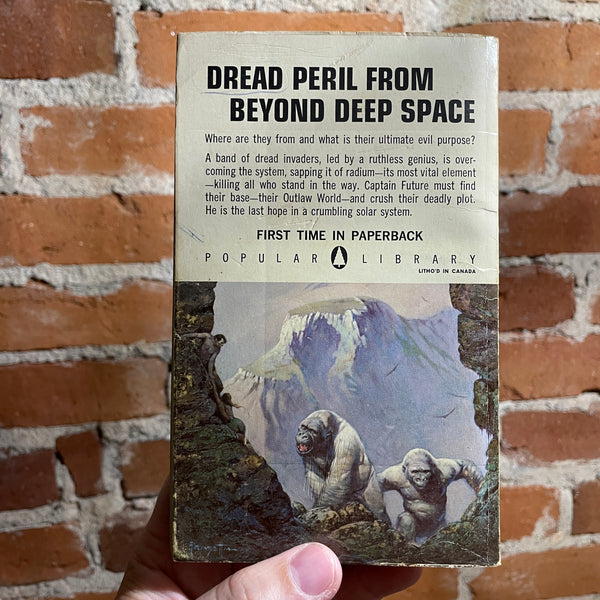 A band of dread invaders, led by a ruthless genius, is overcoming the system, sapping it of radium - its most vital element - killing all who stand in the way. Captain Future must find their base - their Outlaw World - and crush their deadly plot. He is the last hope in a crumbling solar sysytem.”