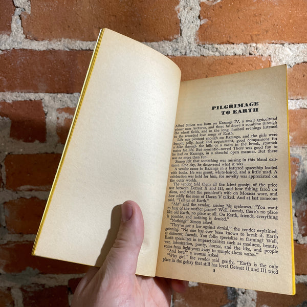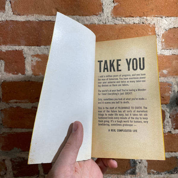 Blurb: “JOIN THE MAN OF THE FUTURE IN PILGRIMAGE TO EARTH