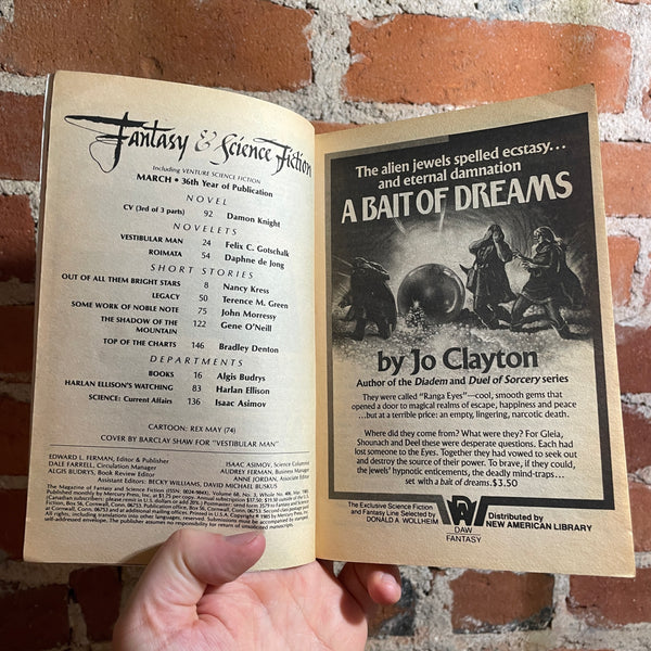Blurb: “Journey into the extraordinary with the March 1985 issue of The Magazine of Fantasy & Science Fiction, featuring Roimata by Daphne de Jong. This edition showcases a captivating blend of speculative fiction, from thought-provoking fantasy to cutting-edge sci-fi, all wrapped in a stunning Barclay Shaw cover. De Jong’s Roimata weaves a tale of mystery and transformation, standing alongside an impressive lineup of stories from some of the genre’s finest voices. Whether you’re a collector or an avid reader, this issue is a must-have for fans of imaginative storytelling.”
