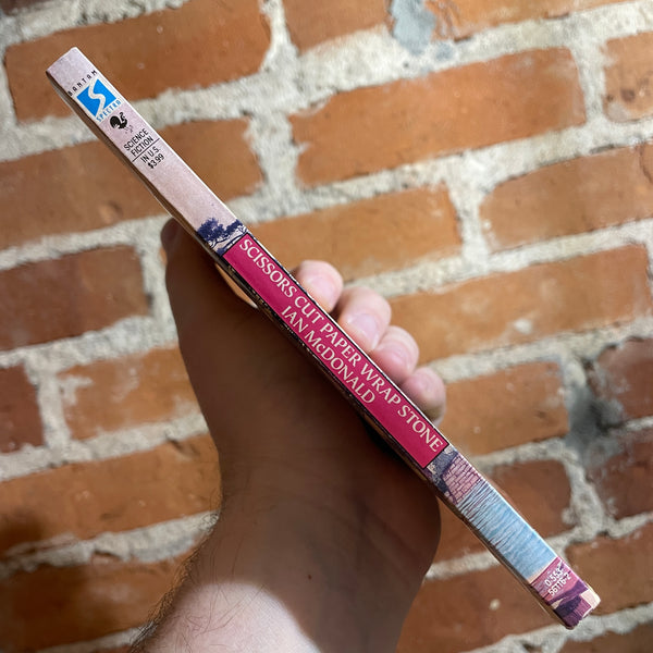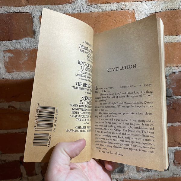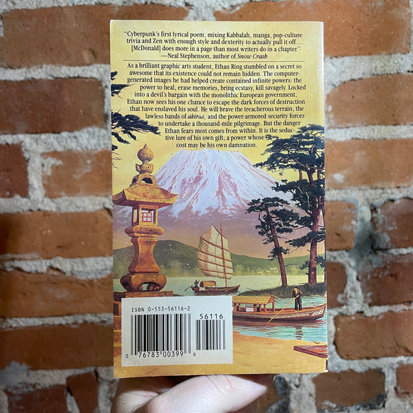 Blurb: “As a brilliant graphic arts student, Ethan Ring stumbled on a secret so awesome that its existence could not remain hidden. The computer-generated images he had helped create contained infinite powers: the power to heal, erase memories, bring ecstasy, kill savagely. Locked into a devil's bargain with the monolithic European government, Ethan now sees his one chance to escape the dark forces of destruction that have enslaved his soul. He will brave the treacherous terrain, the lawless bands of akiras, and the power-armored security forces to undertake a thousand-mile pilgrimage. But the danger Ethan fears most comes from within. It is the seductive lure of his own gift, a power whose i cost may be his own damnation.”