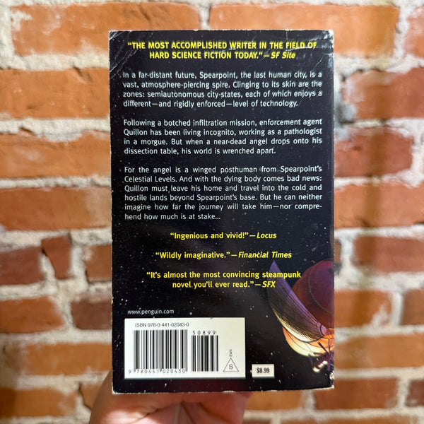 Blurb: “In a far-distant future, Spearpoint, the last human city, is a vast, atmosphere-piercing spire. Clinging to its skin are the zones: semiautonomous city-states, each of which enjoys a different-and rigidly enforced-level of technology.