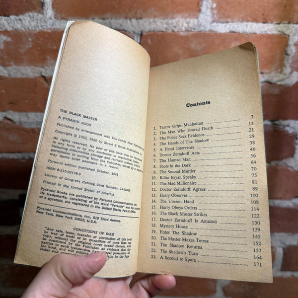Not since Sherlock Holmes locked wits with Professor Moriarity have there been such formidable opponents on the battlefield of crime! The Shadow, the elusive voice in the night whose mocking laughter haunts all who have ever heard it; the man of many faces who is all things to all people in the name of justice. And The Black Master whose invisible hand kills the very men who serve him, leaving no trace, no quarter, not even an ounce of pity. Only terror...and a black metal tag which promises more to come.