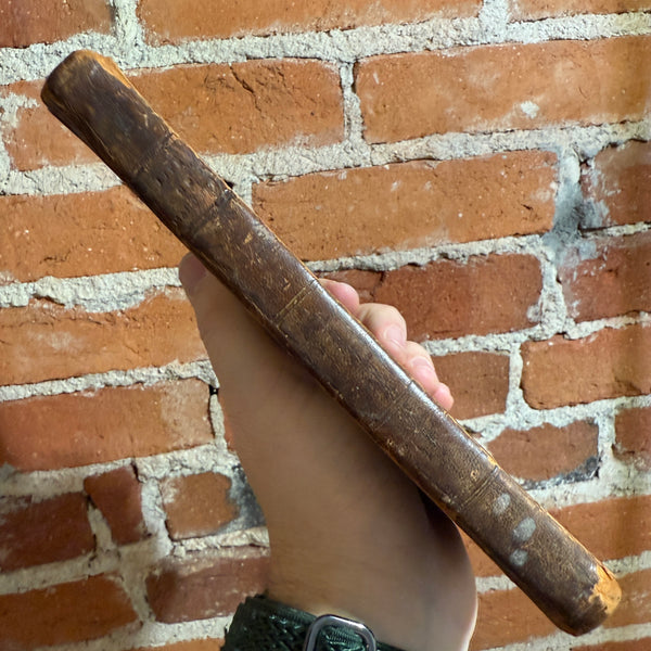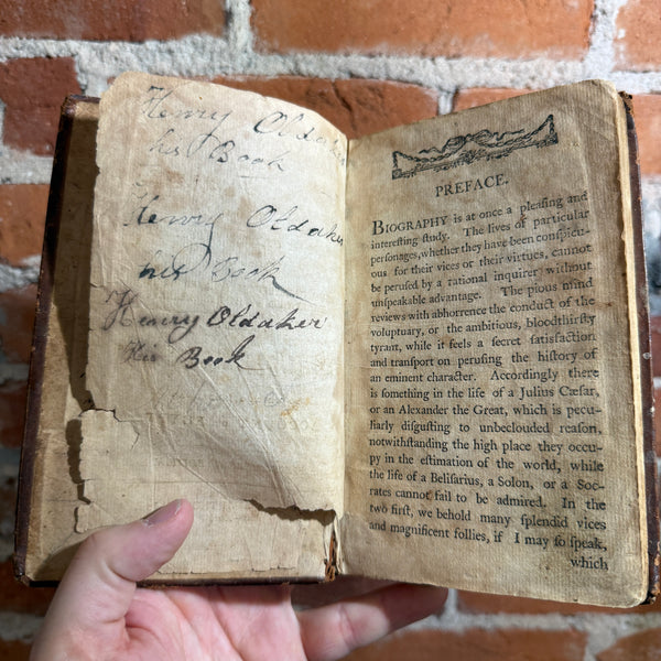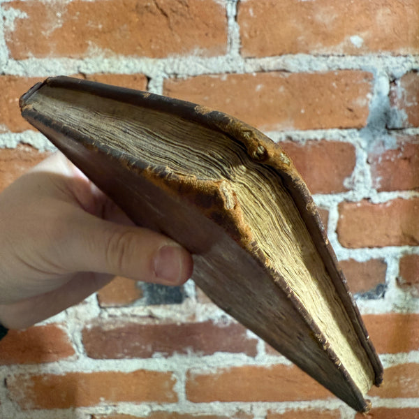 Bound in worn original leather, the book shows more than two centuries of use: heavy surface wear, edge loss, cracking, and scattered staining to the boards; age-toned pages with foxing; and extensive period manuscript notes, calculations, and ownership inscriptions throughout the front matter. These handwritten additions give the volume a strong sense of provenance and lived history, making it as much an artifact as a text.
