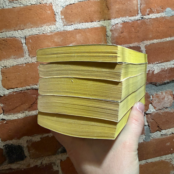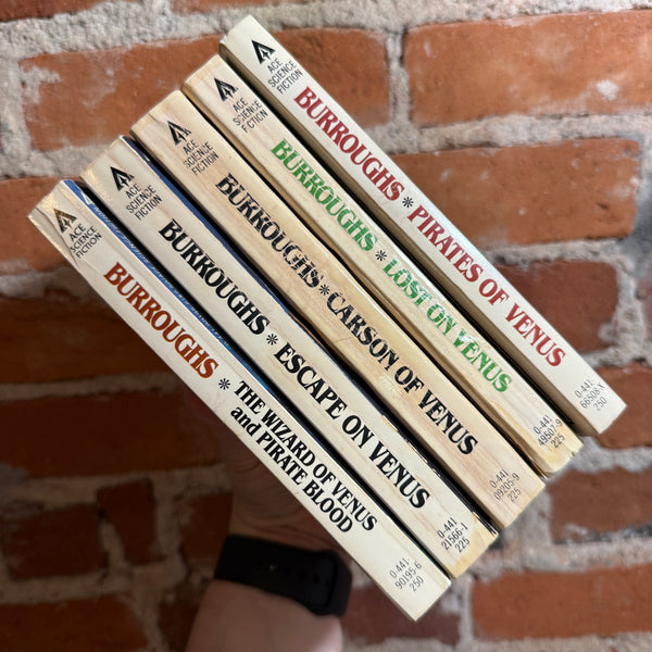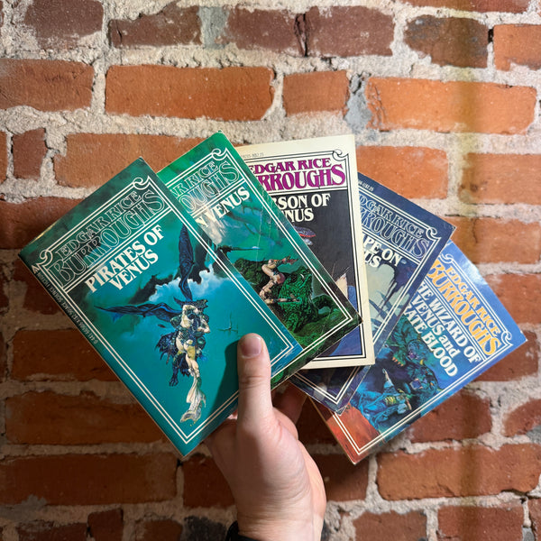 Blurb: “A complete five-book run of Edgar Rice Burroughs’ Venus series in classic Ace Science Fiction paperbacks—pulpy, fast-moving planetary romance at its finest. Set on the cloud-shrouded world of Amtor (Venus), these novels deliver aerial pirates, lost civilizations, monstrous creatures, and relentless adventure, all driven by Burroughs’ trademark breakneck pacing.